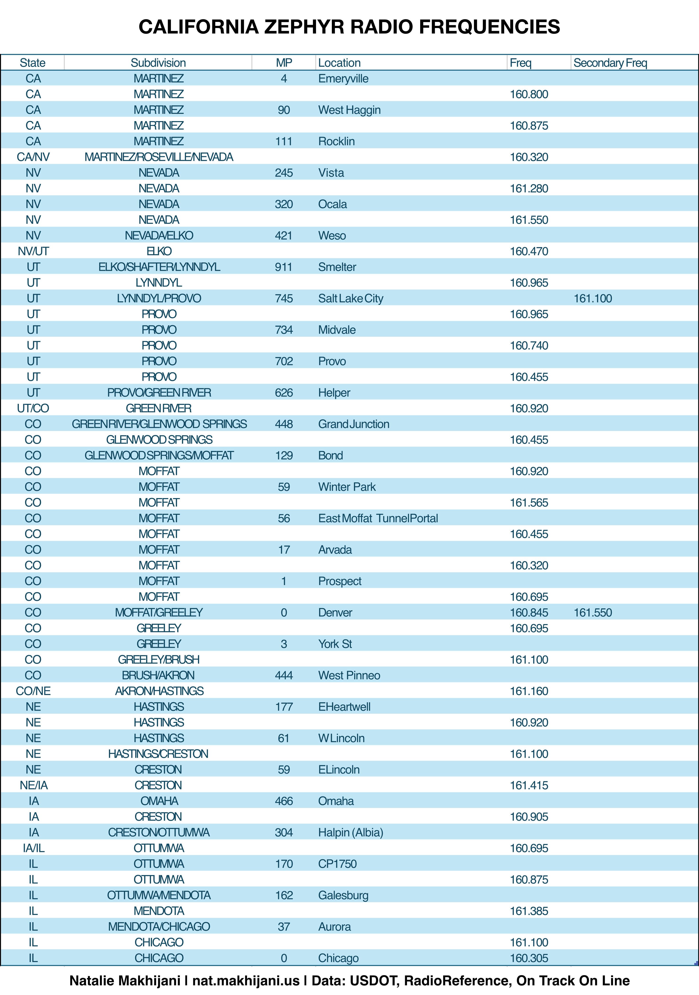 I’ve been frustrated by the lack of information regarding railroad radio frequencies used along the California Zephyr, my most ridden route, so I’ve compiled a chart in a more legible format than those currently available. For train 5 (westbound), read up. For train 6, read down. Channel borders are listed with mileposts, subdivision information, and locations, so the reader can easily figure out what channel they should be on.